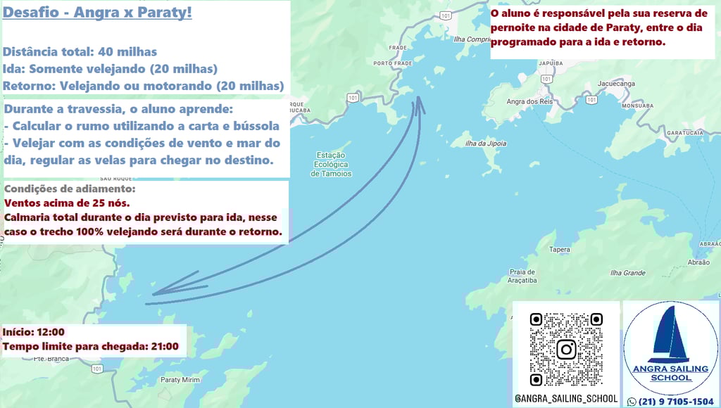 A Angra Sailing também indica a experiência de receber instrução de vela e navegação junto a Rumo Certo, a bordo de um veleiro de 36 pés, ideal para pequenos grupos ou interessados em ter a experiência de travessias ao longo da costa brasileira